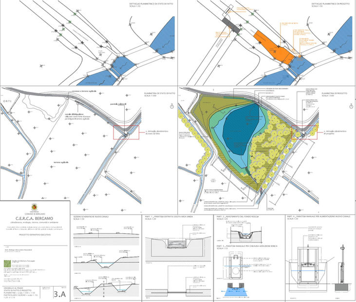 Per creare l’afflusso continuo di acqua – necessario alla vita del laghetto – si realizza una captazione in corrispondenza di un manufatto già esistente, situato a nord est dell’area di intervento; da qui l’acqua, passando per un canale già esistente (utilizzato finora solo per irrigazione e quindi normalmente asciutto) viene condotta ad una paratoia di nuova formazione realizzata con assi di legno supportati da struttura in acciaio - che consente l’afflusso dell’acqua al laghetto per sfioro.